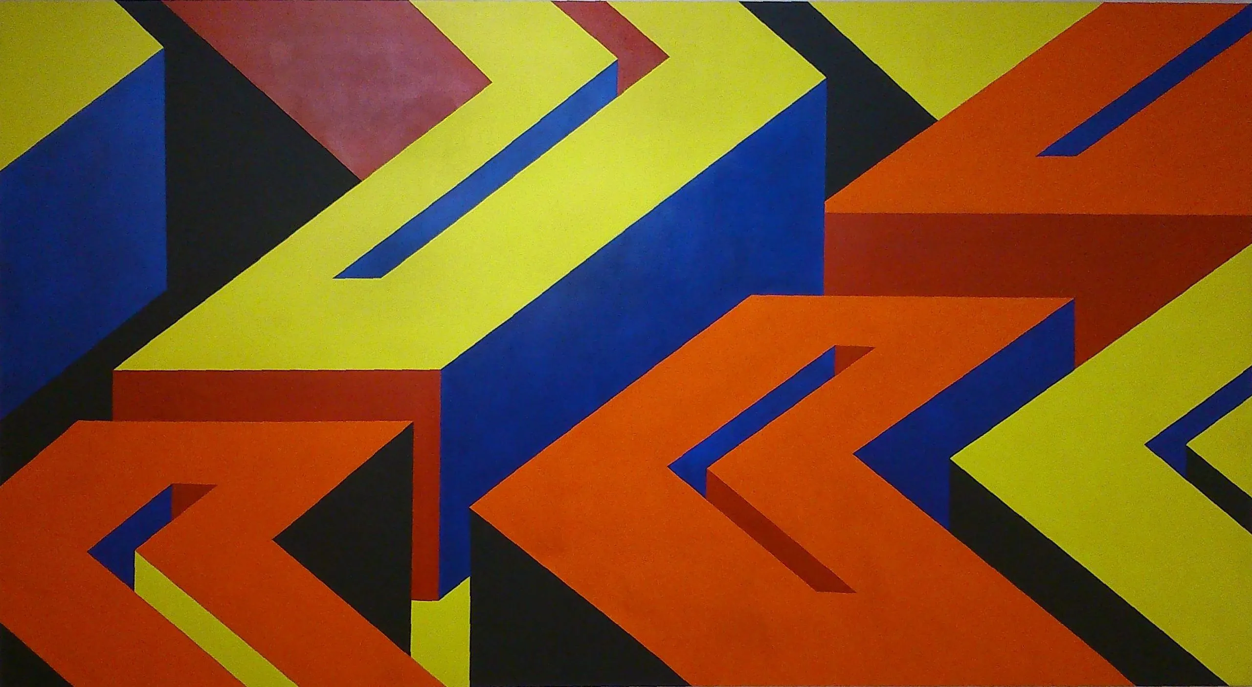 És inevitable referir-se inicialment a l’obra més impactant de la sala, Sabro nº 2, feta entre 1989 i 1991. Està composta per elements simples formats per franges horitzontals i diagonals creant angles més o menys aguts. Es crea una inicial impressió de profunditat i de tercera dimensió que, tot seguit, sembla desmentir la lògica dels camps de color, vius i plans: vermells, taronges, grocs, negres, blaus, que juguen amb la nostra mirada per inspirar i variar la imaginació.